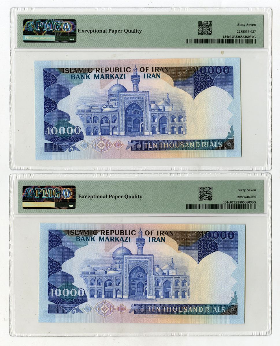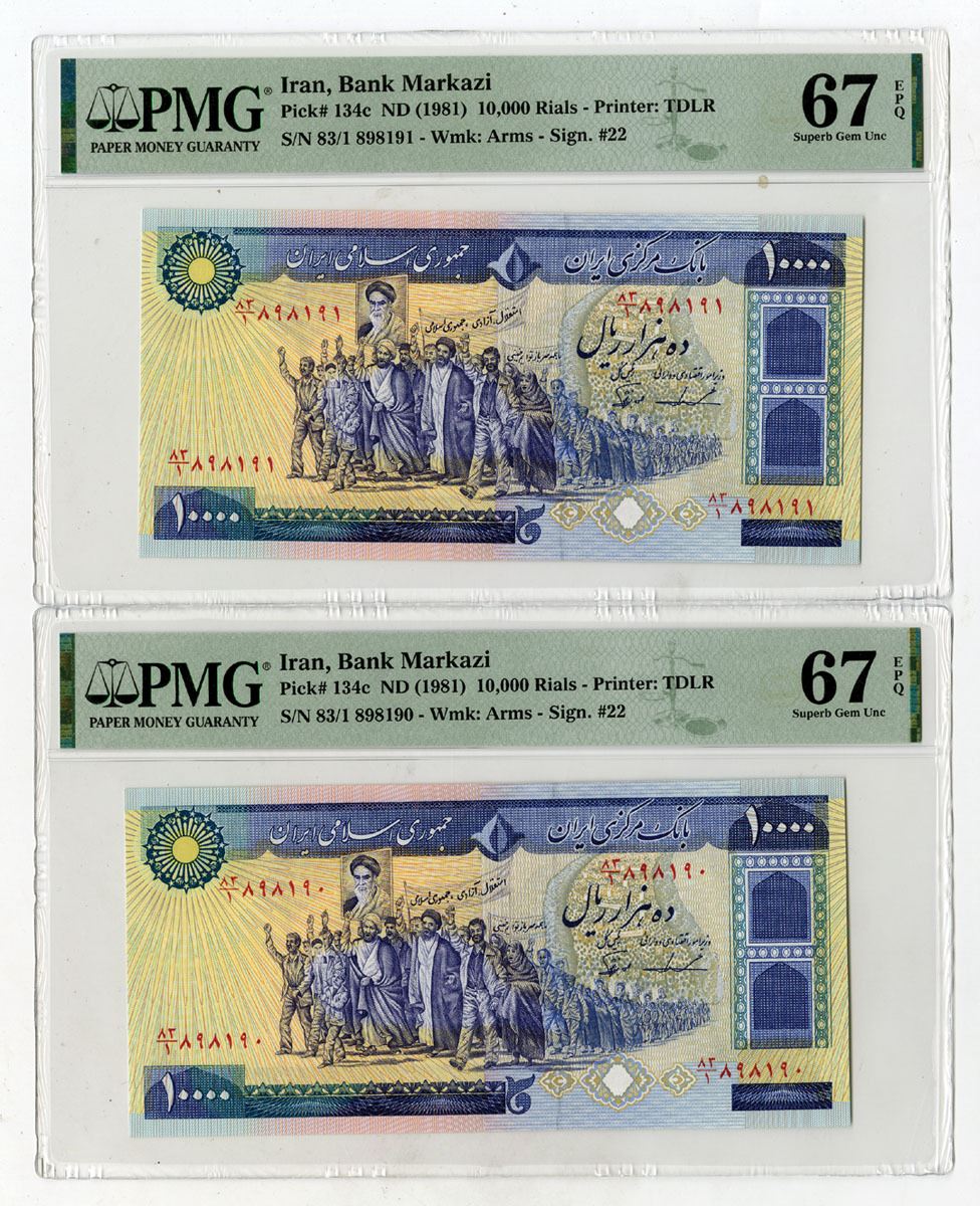 Iran, ND (1981). Lot of 2 sequential banknotes, 10,000 Rials, P-134c, Both are dark blue and green on yellow and m/c underprint with Mullahs leading marchers carrying posters of Ayatollah Khomeini and center, Back is blue and m/c with palace at center, S/Ns 83/1 898190 & 83/1 898191, Both notes are PMG graded Superb Gem Unc 67 EPQ, TDLR. (2). Only 4 notes grade higher out of 89 graded in the PMG census. Sold "AS IS" no returns accepted.