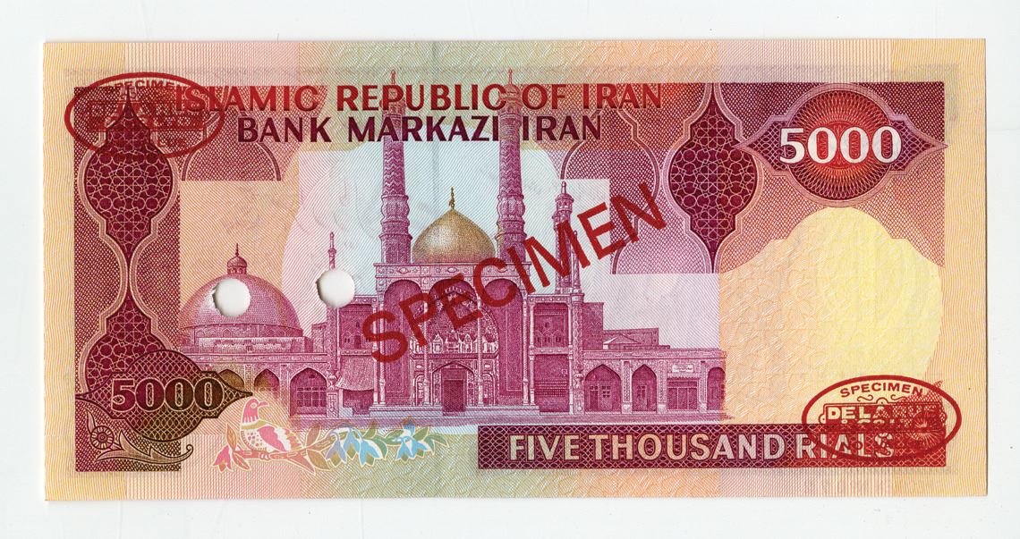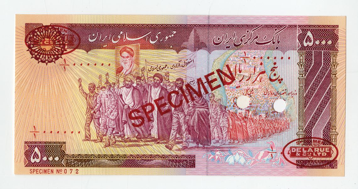 Iran, ND (1981). 5000 Rials, P-133s, Specimen Banknote, Violet with red-orange and brown on m/c underprint, Mullahs leading marchers carrying posters of Ayatollah Khomeini and center, S/N 1/1 000000-072, Specimen overprints and POC's, Uncirculated to Gem Uncirculated condition. Printer: TDLR.