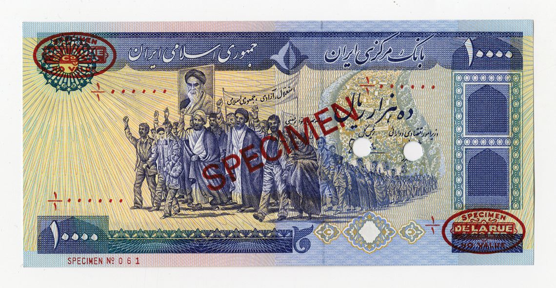 Iran, ND (1981). 10,000 Rials, P-134s, Specimen Banknote, Dark blue and green on yellow and m/c underprint, Mullahs leading marchers carrying posters of Ayatollah Khomeini and center, S/N 1/1 000000-061, Specimen overprints and POC's, Choice AU to Uncirculated condition. Printer: TDLR.