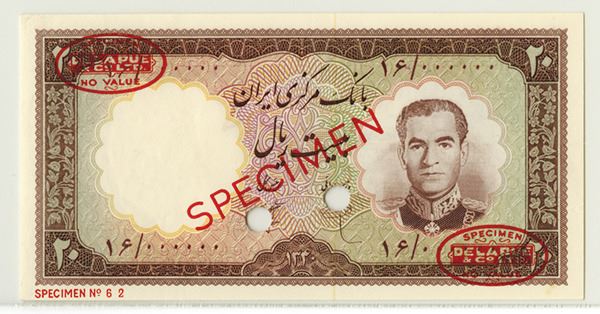 Iran. 1961, 20 Rials, P-72s Unlisted as a Specimen in SCWPM, Specimen and Oval TDLR overprints on top left and lower right corners, Minor Mounting remnants on back right margin that is difficult to view. S/N 16/000000 62, PCGS graded Very Choice New 64, POC, TDLR.