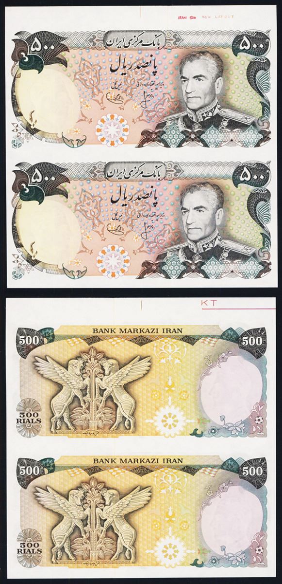 Iran, ND (1974-79), 500 Rials, P-104ar, Portrait type VIII, uncut vertical pair of 2 partially printed notes, missing serial numbers. Large margin on top with red "Iran 500 - New Layout" printed. PMG graded Gem Uncirculated 66 EPQ, Rare as uncut sheet. TDLR.