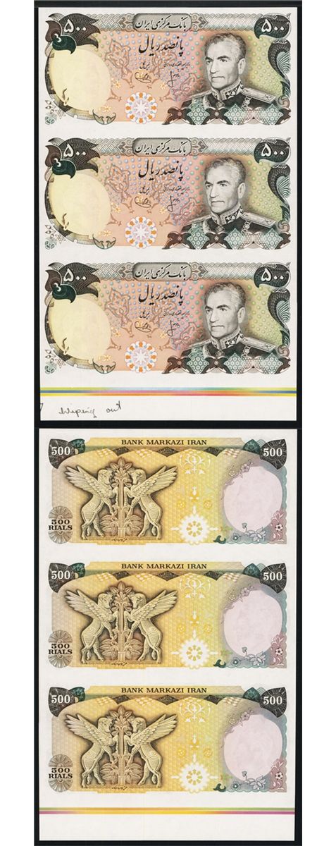 Iran, ND (1974-79), 500 Rials, P-104ar, Portrait type VIII, uncut vertical strip of 3 of partially printed notes, missing serial numbers. Large margin on bottom. PMG graded Gem Uncirculated 66 EPQ, Rare as uncut sheet. TDLR.