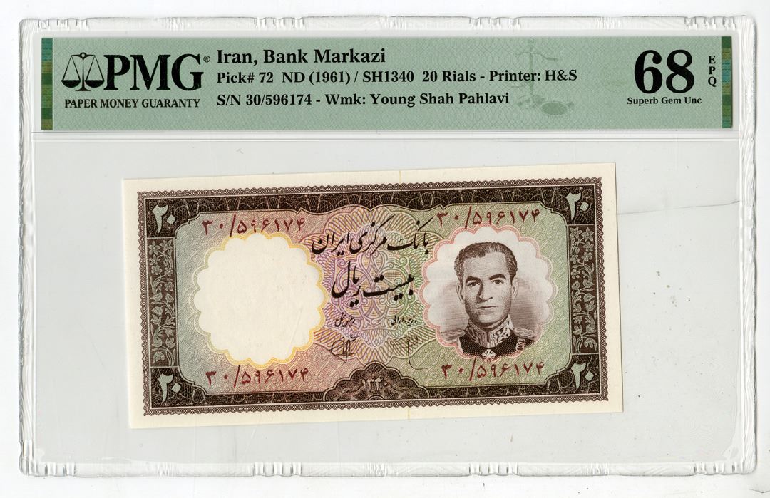 Iran, ND (1961)/SH1340. 20 Rials, P-72, Issued Banknote, Brown on m/c underprint with portrait of Shah Pahlavi at right, Back is brown, S/N 30/596174, PMG graded Superb Gem Uncirculated 68 EPQ, H&S.