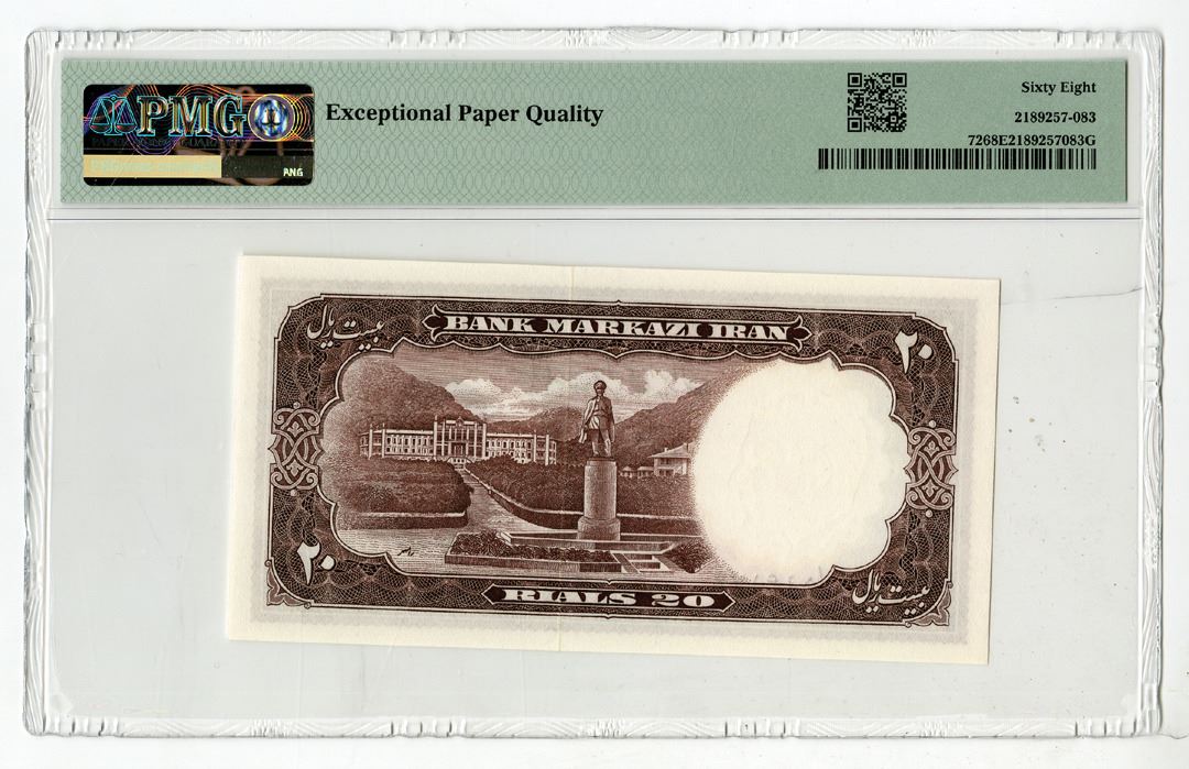 Iran, ND (1961)/SH1340. 20 Rials, P-72, Issued Banknote, Brown on m/c underprint with portrait of Shah Pahlavi at right, Back is brown, S/N 30/596174, PMG graded Superb Gem Uncirculated 68 EPQ, H&S.
