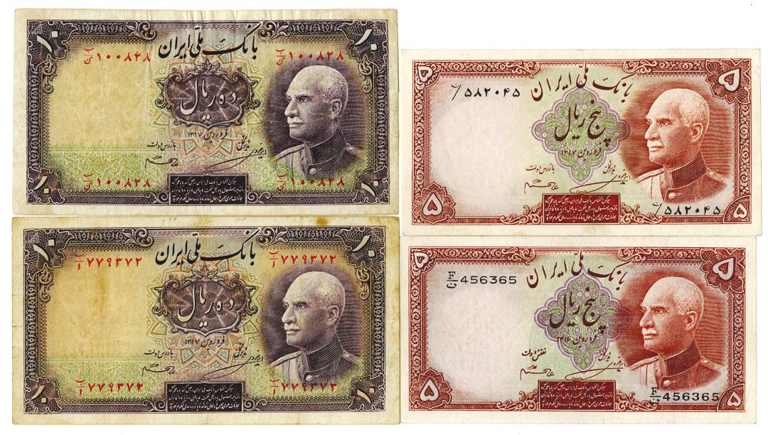 Iran. 1316-1317. 5 Rials and 10 Rials, P-32a; 32Aa; 33Aa, issued banknote quartet, Fine to VF (4).