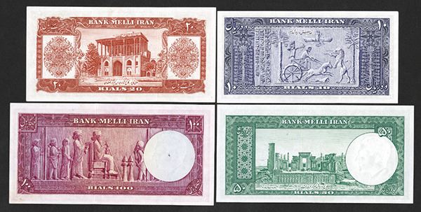 Iran, lot of 4 issued notes, includes 10 Rials, SH1330 (1951), P-59; 20 Rials, SH1330 (1951), P-60; 50 Rials, SH1330 (1951), P-61; and 100 Rials, SH1330 (1951), P-62, Uncirculated to Choice Uncirculated.