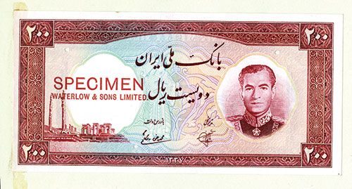 Iran, 1958, 200 Rials, P-70 Unlisted Color Trial in Dark red-maroon on turquoise, peach and m/c instead of issued blue on purple, orange and m/c, back Dark red-maroon, Shah Pahlavi on right, Red “SPECIMEN WATERLOW & SONS LIMITED” overprint on left, POC's and no S/N's, Appears Uncirculated, mounted on large thin card at left border and could possibly be removed. W&S.