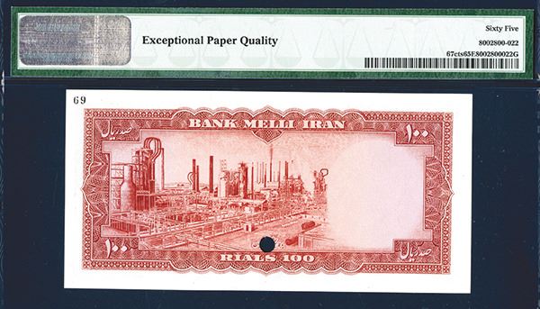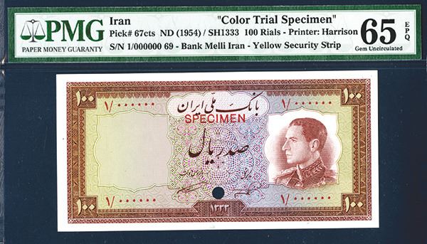 Iran, ND (1954) / SH1333, 100 Rials, P-67cts, Unlisted Color Trial, brown on m/c instead of issued Maroon on m/c, S/N 1/000000 - 69, Specimen overprint, POC, Yellow security thread, PMG graded Gem Uncirculated 65 EPQ (Exceptional Paper Quality), Printer: Harrison without imprint. Attractive and exceptional condition color trial that will enhance any advanced collection.
