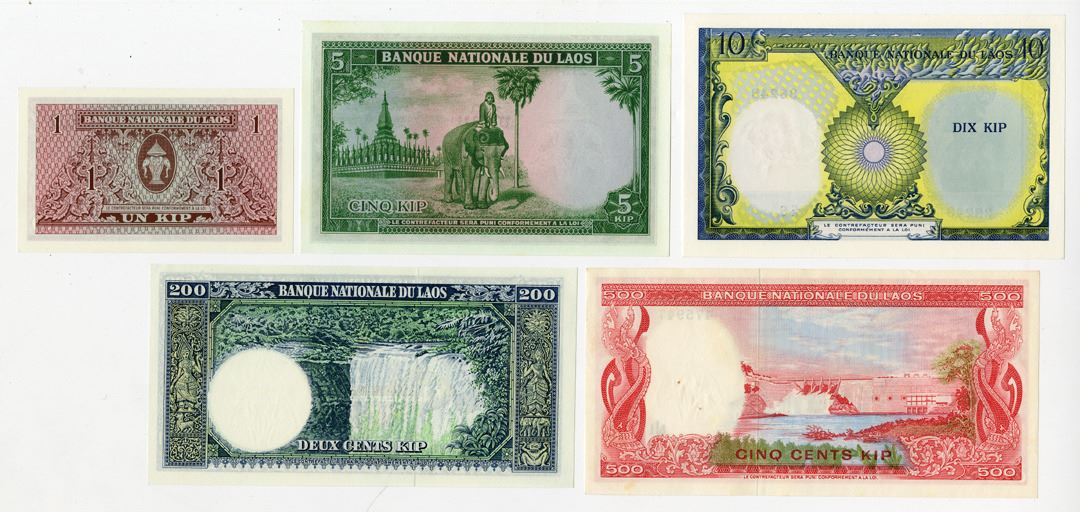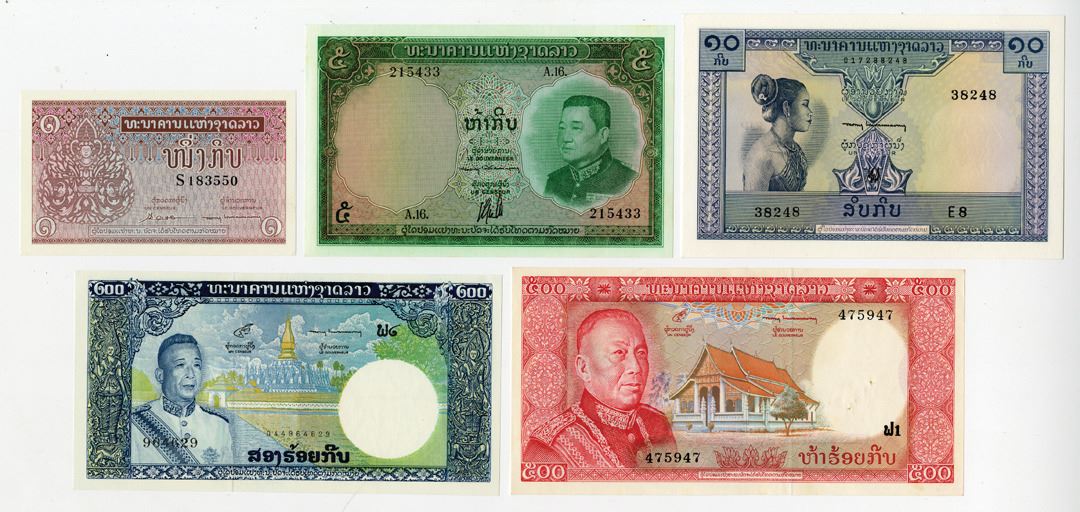 Laos……, ca. 1950-60s. Lot of 8 issued banknotes: 1 Kip P-8a; 5 Kip P-9b; 10 Kip P-10b; 200 Kip P-13b; 1000 Kip P-14a; 500 Kip P-17a; 5000 Kip P-19a; and 100 Kip P-6a. Choice VF to CU Condition, Sold "AS IS", No returns accepted. (8)