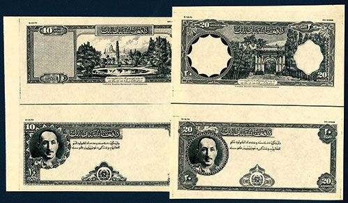Afghanistan, March 13, 1970, Lot of 2 photo-proofs of banknotes and one matching photo proof of vignette, Includes 10 and 20 Afghanis photographic proofs printed in black on light tan paper, each with face on bottom and back on top, King Muhammad Zahir at left facing forward on front, the back of the 10 Afghanis note has palace with fountain, the back of the 20 Afghanis has arched monument, a photo proof of the arch monument is also included with archival notations and measurements, All are in excellent to Uncirculated condition. Evidently a proposal from United States Banknote Corporation that was rejected. Only 1967 and 1973 dated banknotes were issued. Rare archival proof from ABN archives.