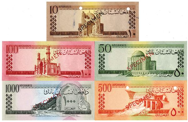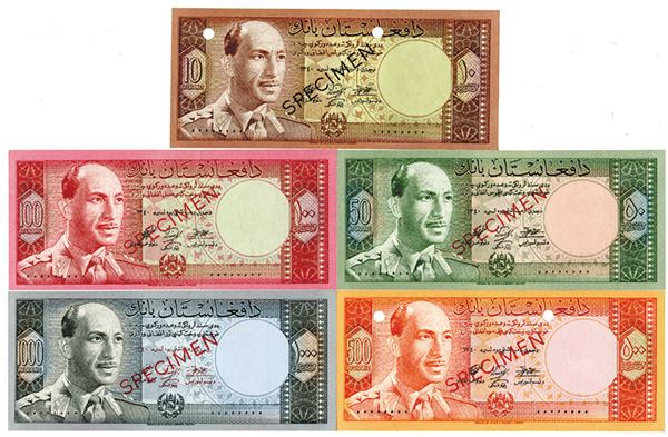 Afghanistan. Lot includes a quintet of specimen 10, 50, 100, 500, and 1000 Afghanis banknotes, all overprinted SPECIMEN, with zero s/n, and the 10 and 500 Afghanis with POCs. P-37; 39; 40; 40A; 42. Choice to Gem Uncirculated. Attractive banknote set. (5)