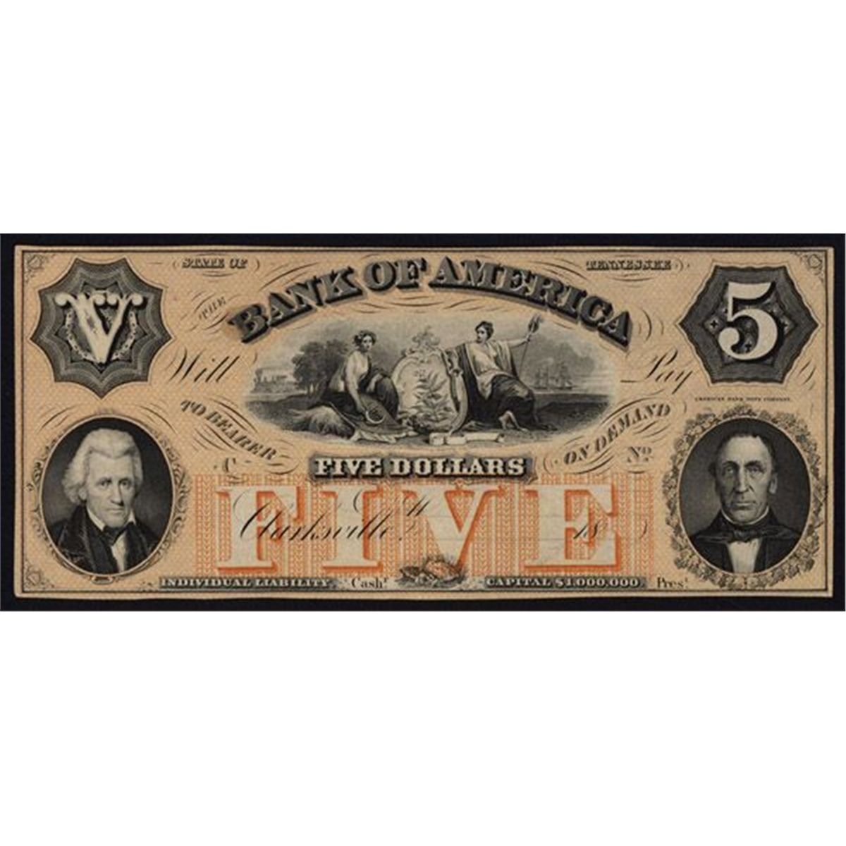 Clarksville, TN 18xx (ca.1859-60), $5, TN-15-5Ab, Remainder, Black on Orange-ochre, Jackson on lower left and Bank notable on lower right, allegorical women flank arms in middle, back blank, Uncirculated to CU condition with a small ink or glue spot in the middle back. Attractive and high grade Tennessee obsolete. ABNC.