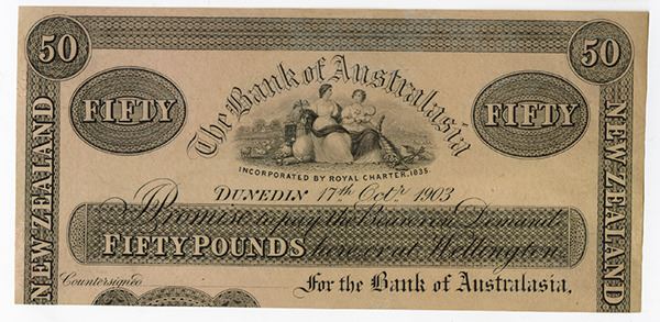 Dunedin, New Zealand. £50, P-S121e Unlisted Proof as well as Branch Issue, Black on soft light pink india type of paper, Seated allegorical women under title at top, arms upper left, 4 light glue stains on blank back corners, the bottom signature blocks have been cut to cancel the proof. AU condition. PBC. Rare note in any format and condition and this may be the only way to collect an example of this note. Rare note in any format and condition and this may be the only way to collect an example of this note. There are no graded issued or proof notes in the PMG census.