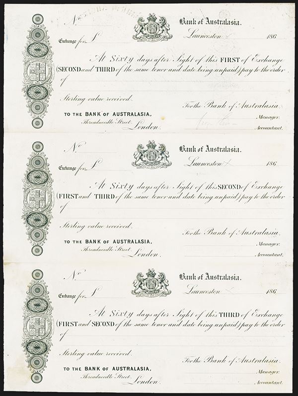 Launceston, Tasmania, Australia. 186-. Uncut sheet of 3 proof 1st, 2nd and 3rd Bills of Exchange printed in black. Correspondent bank in London, England. Printed on thick india type of paper. Vignette of lions, unicorn and crown in middle and counterfoil of bank arms on left. All are in VF to AU condition with minor toning and glue stains. Printed by Perkins, Bacon & Co., London. PBC.