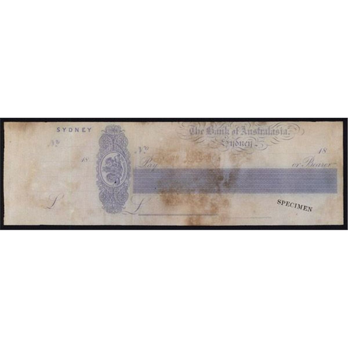 Sydney, Australia, 18xx, (ca.1840-50's), Specimen check, Gray printed on white, Specimen oveprints, Arms of bank on left, VG condition with toning and foxing, Rare as specimen, PBC.