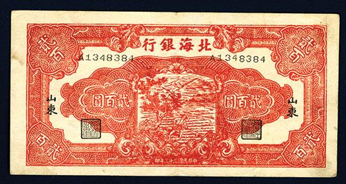 200 Yuan, P-S3573b (S/M#P-21-33c), Issued banknote, Red orange with peasant hoeing at center, Shantung in black on face, Choice XF to AU condition. Rare note in any condition.