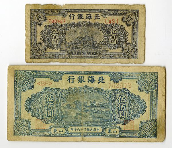 China, Lot of 2 notes, Both are 500 Yuan notes, Includes 1947, Shantung, P-S3620E, VF; and 1948, P-S3622D, Fine.