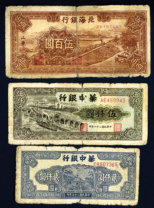 Lot of 3 notes, Include 1947, Bank of Bai Hai, 500 Yuan, P-S3320b, Fine; 1948 and 1949, Bank of Central China, 2000 & 5000 Yuan, Issued, Fine and VG. Scarce communist trio.