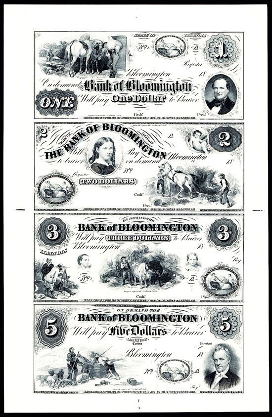 Bloomington, Illinois. Lot of 4 notes (uncut sheet of 4), 18xx (ca.1960-70's), $1-2-3-5, (IL-60-G2a; IL-60-G4a; IL-60-G6a; IL-60-G8a SENC) Modern ÒProprietary ProofsÓ. The $1 proof has a man with sack and 2 horses on the left, and portrait of man at right; the $2 note has farmer plowing on right with girl in middle; the $3 has surveyors on left and oxen pulling wagon in middle; and the $5 note has men with boat and dogs with sled on lower left and man on lower right. Black printing without underprint printed on thin white card, Choice to Gem Uncirculated condition. The $5 note is listed as ÒSENCÓ in Haxby. TC&C. Archival ÒProprietaryÓ proofs rarely seen in sheet form. (ABN Commemoratives, AIA XI, May 15, 2012)