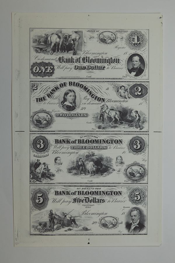 Bloomington, Illinois. Lot of 4 notes (uncut sheet of 4), 18xx (ca.1970's), $1-2-3-5, (IL-60-G2a; IL-60-G4a; IL-60-G6a; IL-60-G8a SENC) Modern "Proprietary Proofs". The $1 proof has a man with sack and 2 horses on the left, and portrait of man at right; the $2 note has farmer plowing on right with girl in middle; the $3 has surveyors on left and oxen pulling wagon in middle; and the $5 note has men with boat and dogs with sled on lower left and man on lower right. Notches on all 4 margins for printing registration. Black printing without underprint printed on thin white card, Uncirculated condition. The $5 note is listed as "SENC" in Haxby. TC&C. Archival "Proprietary" proofs rarely seen in sheet form.