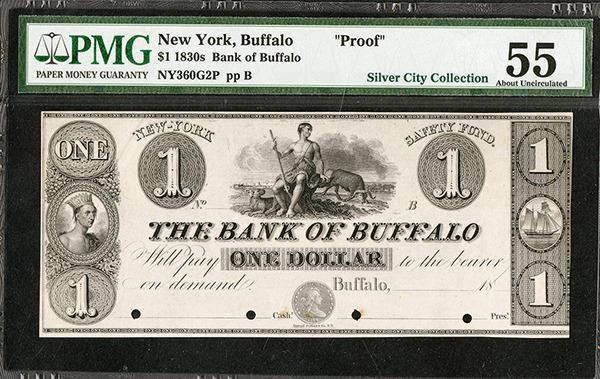 Bank of Buffalo Coin Note, ca.1830's Obsolete Proof. Buffalo, New York, 18xx (ca.1830's), $1, Plate B, NY-360-G2, SENC, Proof banknote, black on india paper, Native American on left with hunter with rifle, oxen and dog at center, sailboat on right and 1799 U.S. Silver Dollar on bottom. POC's, PMG graded About Uncirculated 55 condition. Durand, Perkins & Co., New York imprint. (silver City Collection, AIA Sale VIII, Lot 1167).