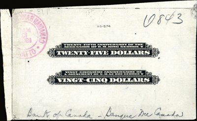 Ottawa. Canada. 1935. $25. 2 different cut down LDP's and original artwork of border text and denomination of this rare issue. 1). Compound LDP of face denomination and text below the portrait vignettes of the French and English versions. Text states in English "Twenty-Fifth Anniversary of the Accession of H.M.King George V" and "Twenty-Five Dollars" below. The French version is below the English version on the same proof. Red circular handstamp "Canadian Bank Note Co. Ltd. - Mar. 13, 1935 - Ottawa" on back; 2). Compound proof of back denomination text found beneath Windsor Castle vignette. Both English and French versions are present. Text states " Windsor Castle - Twenty-Five Dollars" on the English version with the French version below. Also with similar red stamp on back; 3). Model or mockup of "25" numeral found next to the vignette on face of note. Additional archival and production notations present related to changing the size of the numeral vignette. All in XF condition. Unique in archive. Rare proofs from this historic issue. CBNC