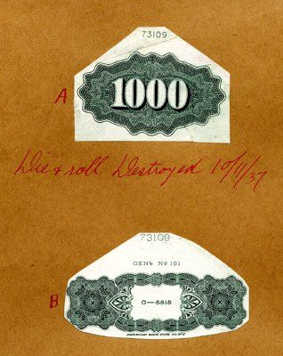 Ottawa. Canada. ca.1935. P-56; P-57 Unlisted. $1,000. 4 different face and back proofs. All are mounted on manila file folders and are in mixed condition. Denomination counters for P-56 and 57 of the numeral "1000" printed on india paper and mounted in manila file folders. All of the vignettes were used in the design and production of this banknote and could be found on the face or the back of the note in the corners or as part of the denomination vignettes. Also included is one file folder that unfortunately had its contents of a $1,000 face proof cut out, but at least a photo-copy of the image was left for reference. Condition ranges from VG to XF. All with archival notations and hand written "Die Destroyed 10/11/37". Historic and interesting archival material from this popular issue. Canadian BNC.