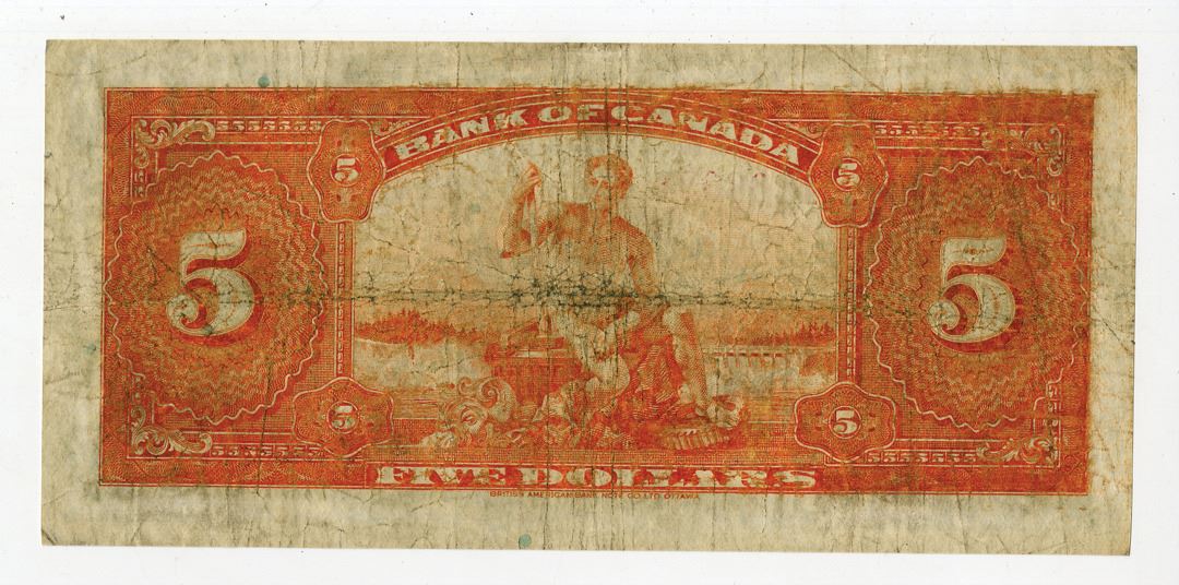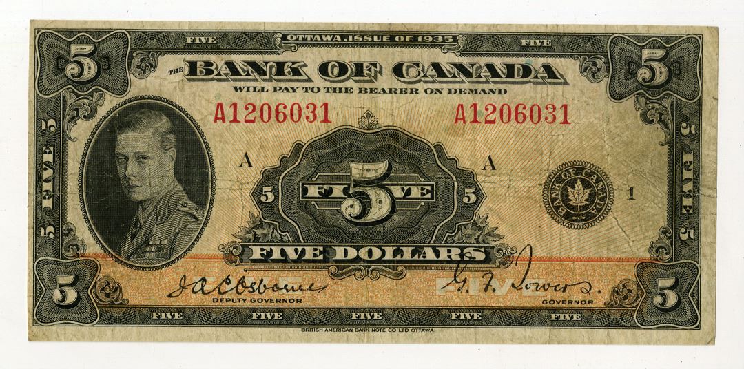 Canada, 1935. 5 Dollars, P-43, Issued Banknote, Black on orange underprint, Portrait of Edward - Prince of Wales at left, Back is orange with Power seated at center, S/N A1206031, Good-Fine condition, BABN.