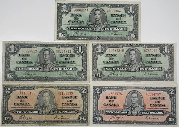 Canada.... Lot includes a quintet of KGVI-era issued $1 and $2 notes, all with Coyne-Towers signatures. P-58e; 58e; 58e; 59c; 59c. Generally Fine to VF. Sold "As is" no returns accepted for group lots.
