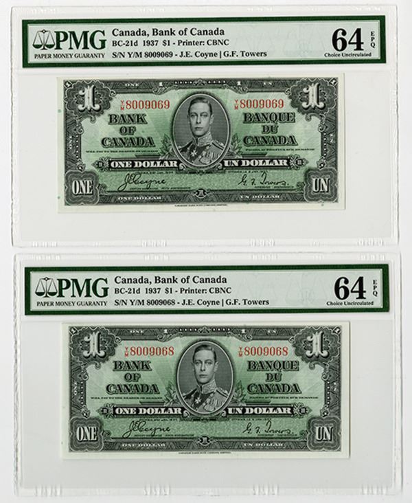 Canada. Sequential pair of issued 1 Dollars, 1937, BC-21d, signatures of Coyne & Towers. Both PMG graded Choice Unc 64 EPQ. CBNC.