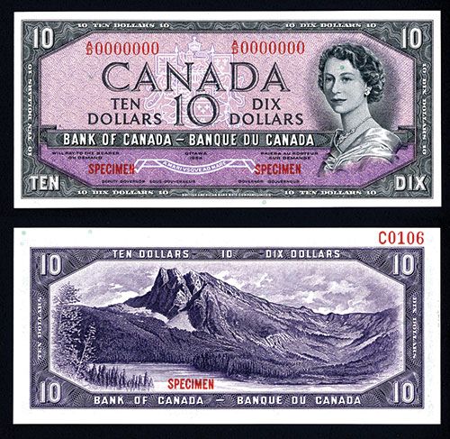 Ottawa, Canada, 1954. $10, P-69, Unlisted Specimen banknote. Queen Elizabeth II on right with “Devil's Face” in hair, Red specimen overprints, “A/D 0000000” serial numbers and “C0106” on back right top excess margin, POC's. Choice to Gem Uncirculated with clear mounting remnant on right back margin that possibly could be removed but is very difficult to see. Canadian BNC.