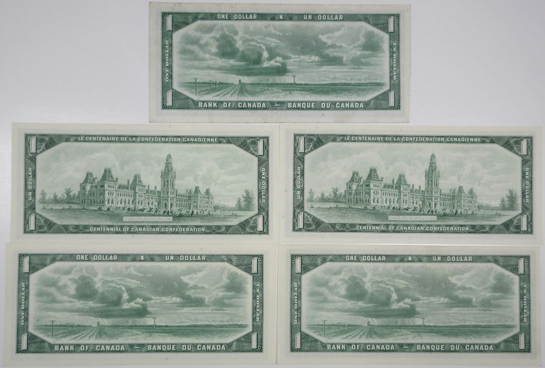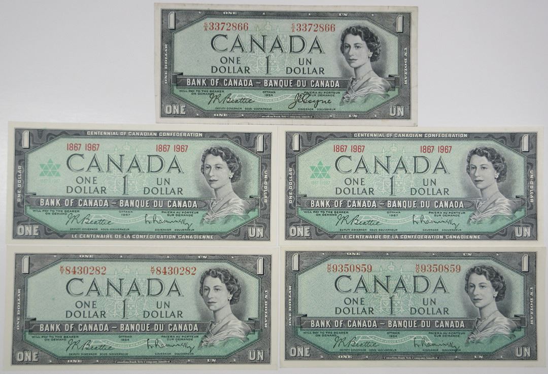 Canada. Lot of 5 notes, includes a quintet of QEII issued $1 notes, including one "Devils Head" variety. P-66b in VF; the balance, P-84a (2); 74b (2) are Choice to Gem Unc. Sold "As is" no returns accepted for group lots. (5)