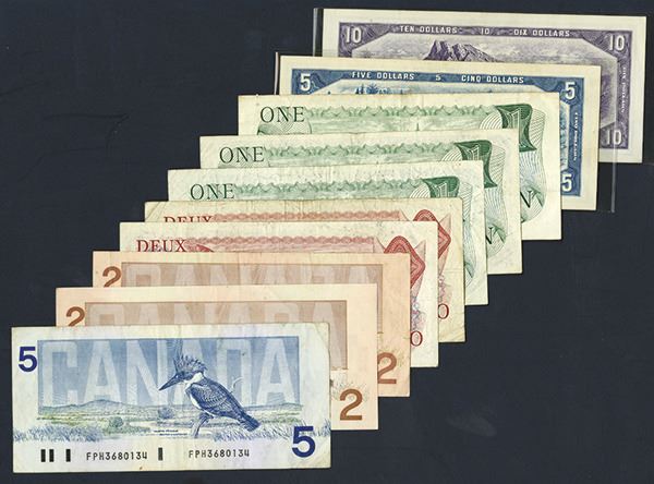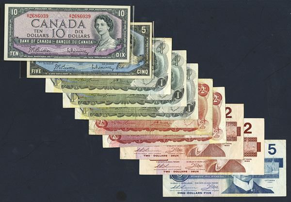 Canada. 5, 10 Dollars. SCWPM 77b, 79b both Very Fine or better; 1 (3), 2 (4), 5 Dollars, VG-Fine. 10 pieces.