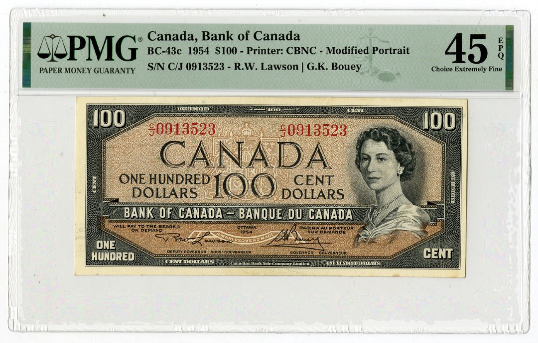 Canada, 1954 (1973-76). $100, P-82c, BC43c, Issued Banknote, Black on brown underprint, Portrait of Queen Elizabeth II at right with modified hairstyle, S/N C/J 0913523, PMG graded Choice Extremely Fine 45 EPQ, CBNC.