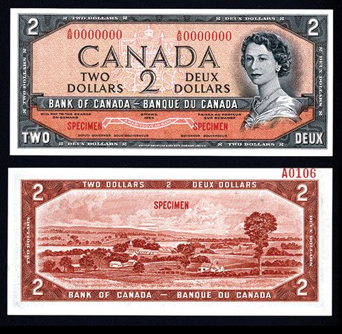 Ottawa, Canada, 1954. $2, P-67, Unlisted Specimen banknote. Queen Elizabeth II on right with “Devil's Face” in hair, Red specimen overprints, “A/B 0000000” serial numbers and “A0106” on back right top excess margin, POC's. Choice to Gem Uncirculated with clear mounting remnant on right back margin that possibly could be removed but is very difficult to see. Canadian BNC.