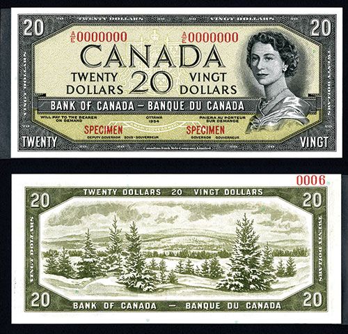 Ottawa, Canada, 1954. $20, P-70, Unlisted Specimen banknote. Queen Elizabeth II on right with “Devil's Face” in hair, Red specimen overprints, “A/E 0000000” serial numbers and “0006” on back right top excess margin, POC's. Choice to Gem Uncirculated with clear mounting remnant on right back margin that possibly could be removed but is very difficult to see. Canadian BNC.