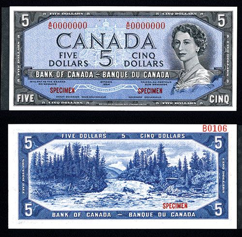 Ottawa, Canada, 1954. $5, P-68, Unlisted Specimen banknote. Queen Elizabeth II on right with “Devil's Face” in hair, Red specimen overprints, “A/C 0000000” serial numbers and “B0106” on back right top excess margin, POC's. Choice to Gem Uncirculated with clear mounting remnant on right back margin that possibly could be removed but is very difficult to see. Canadian BNC.