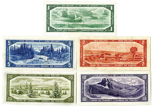 Canada, Lot of 5 notes, all are from the 1954 "Devil's Face" issue, all with Queen Elizabeth at right, Includes $1, BC-29b,Choice VF; $2, BC-30b, VF; $5, BC-31a, VF to Choice VF; $10, BC-32b, VF to Choice VF; and $20, BC-33b, Choice VF to Almost XF, Attractive group of notes, Canadian BNC. (5)