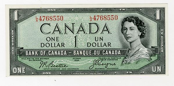 Canada, 1954 "Devil's Face" issue, $1, BC-29b, Issued banknote, Queen Elizabeth at right, S/N L/A 4768550, Uncirculated to Choice Uncirculated condition. Beattie | Coyne signatures, Canadian BNC.