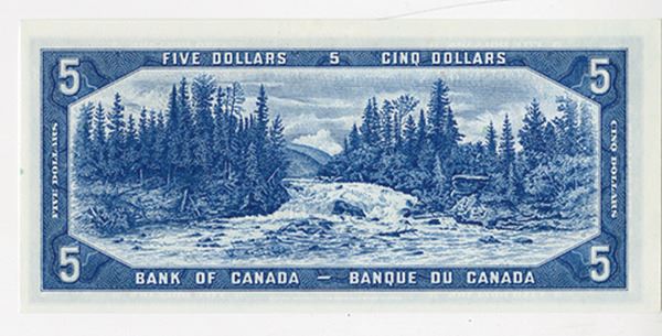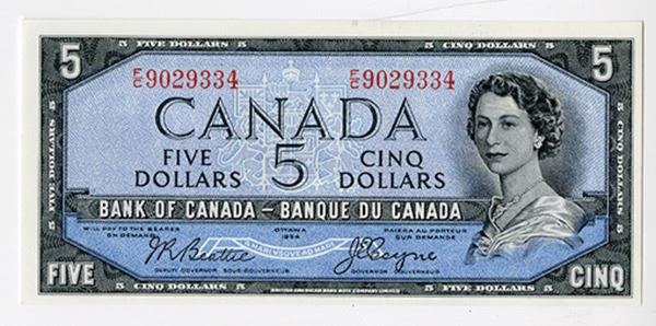 Canada, 1954 "Devil's Face" issue, $5, BC-31b, Issued banknote, Queen Elizabeth at right, S/N F/C 9029334, Uncirculated to Choice Uncirculated condition. Beattie | Coyne signatures, British American BNC.