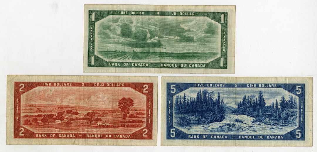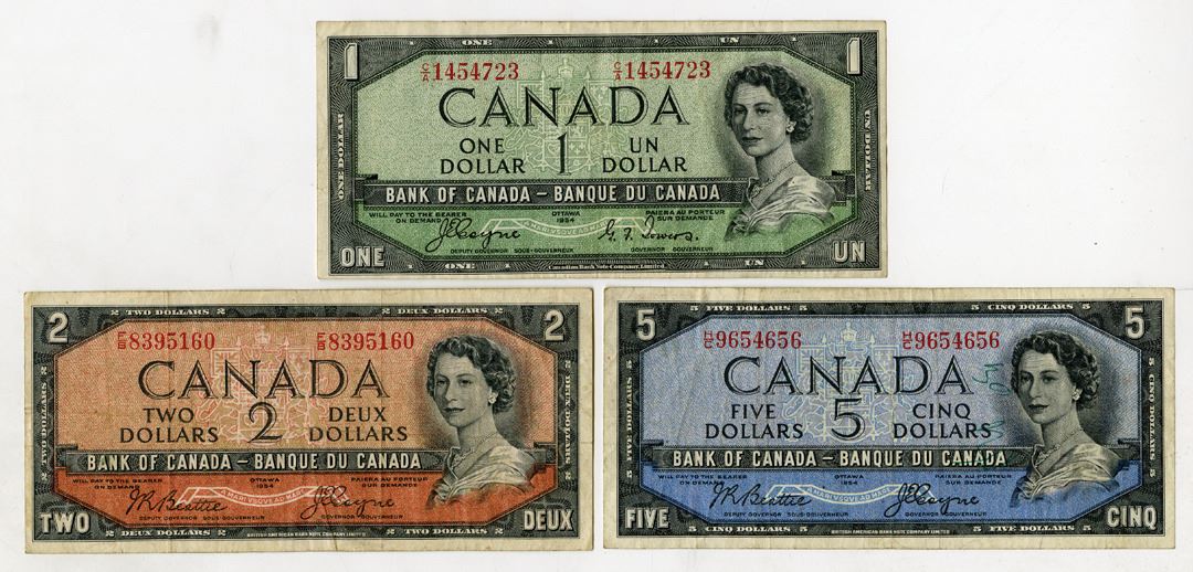 Canada, 1954. Lot of 3 Issued Banknotes, Includes: 1 Dollar, P-66a, Black on green underprint, S/N C/A 1454723; 2 Dollars, P-67b, Black on red-brown underprint, S/N E/B 8395160; 5 Dollars, P-68b, Black on blue underprint, S/N H/C 9654656. All notes have portrait of Queen Elizabeth II at right with "Devil's Face" in hairdo, are in Fine-VF+ condition, and printed by CBNC. (3). Sold "AS IS" no returns accepted.