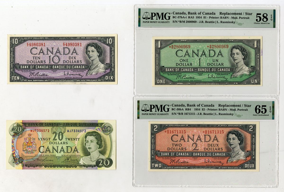 Canada, 1954-69. Lot of 4 Replacement and Issued Banknotes, Includes: $1, P-75b, BC-37bA-I RA5, 1954 (1961-72), S/N *B/M 2800969, PMG Choice About Unc 58 EPQ, BABN; $2, P-76b, BC-38bA RB4, 1954 (1961-72), S/N *B/B 1671315, PMG Gem Unc 65 EPQ, BABN; $10, P-79b, 1954 (1961-71), S/N E/V 4980381, BABN; and, $20, P-89b, 1969, S/N WJ7334572. Ungraded notes range from AU to Unc condition. (4). Sold "AS IS" no returns accepted.