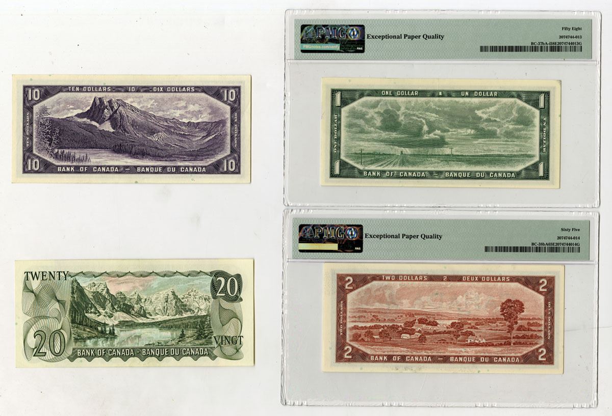 Canada, 1954-69. Lot of 4 Replacement and Issued Banknotes, Includes: $1, P-75b, BC-37bA-I RA5, 1954 (1961-72), S/N *B/M 2800969, PMG Choice About Unc 58 EPQ, BABN; $2, P-76b, BC-38bA RB4, 1954 (1961-72), S/N *B/B 1671315, PMG Gem Unc 65 EPQ, BABN; $10, P-79b, 1954 (1961-71), S/N E/V 4980381, BABN; and, $20, P-89b, 1969, S/N WJ7334572. Ungraded notes range from AU to Unc condition. (4). Sold "AS IS" no returns accepted.