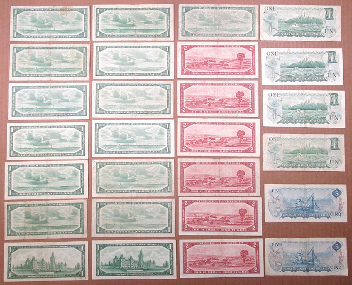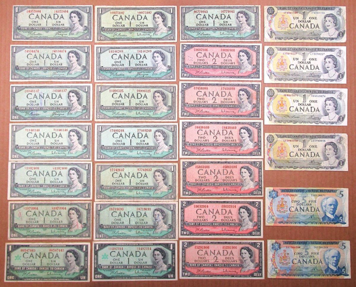 Canada, 1954-72. Lot of 27 Issued Banknotes, Includes: 1 Dollar, P-74 (7), CBNC; 1 Dollar, P-75 (6), BABNC; 2 Dollars, P-76 (6), BABNC; 1 Dollar, P-84 (2); 1 Dollar, P-85 (4); and 5 Dollars, P-87 (2). Notes range from Good to Fine condition. (27).