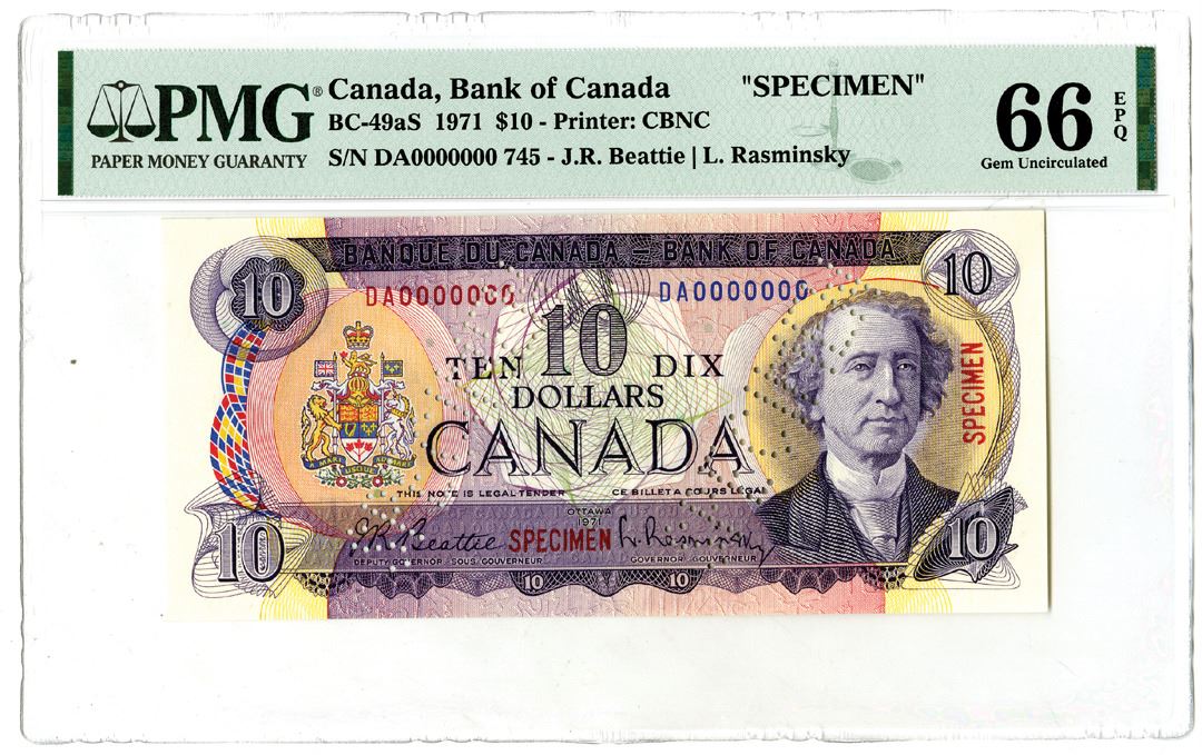 Canada. Bank of Canada. 1971, $10 BC-49aS Specimen PMG graded Gem Unc 66 EPQ S/N DA0000000 745, Beattie - Rasminsky Sigs. CBNC. Red specimen overprints, Pin-punch Only 2 notes grade 1 grade designation higher out of 65 graded in the PMG census. This will be difficult if not impossible to improve upon.