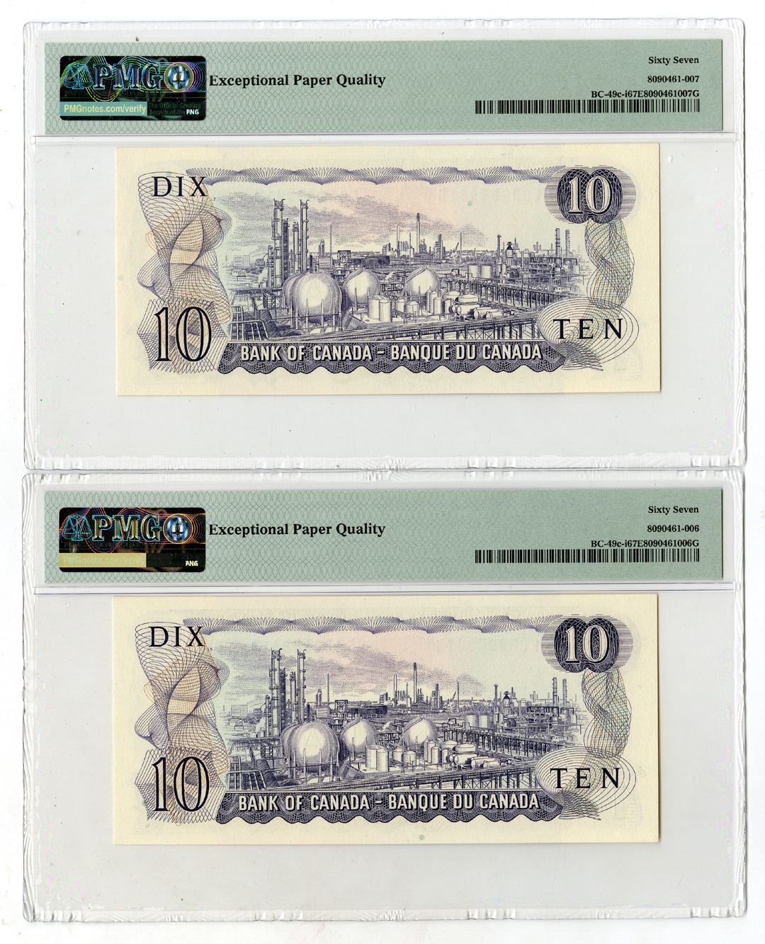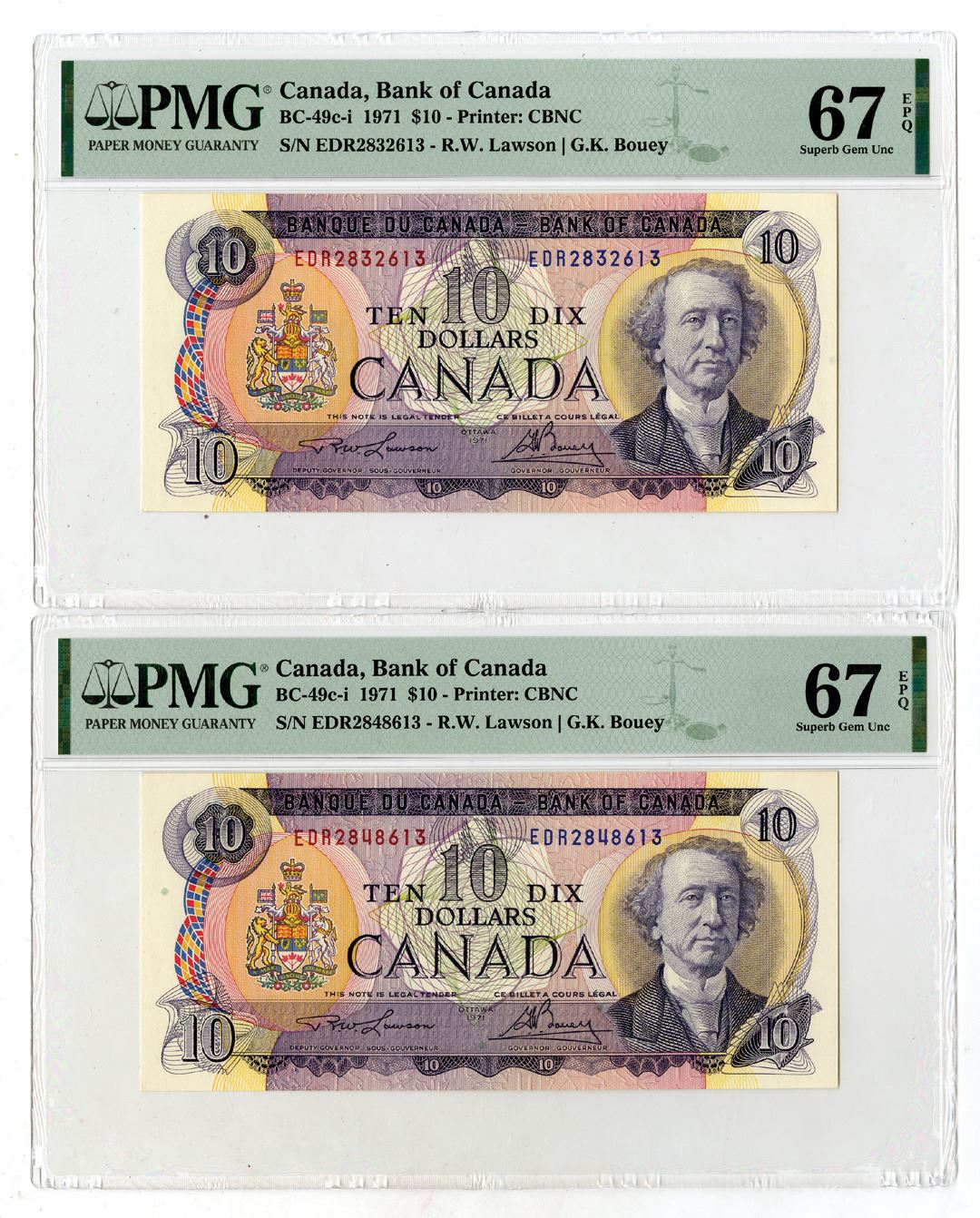Canada, 1971. 10 Dollars, P-88c (2) BC-49c-I, Pair of Issued Banknotes, Purple on m/c underprint with Sir John A. Macdonald at right, Arms of Canada at left, S/Ns EDR2832613 & EDR2848613, Both notes are PMG graded Superb Gem Uncirculated 67 EPQ, CBNC. (2). Sold "AS IS" no returns accepted. Only 8 notes grade 1 increment higher out of 136 graded in the PMG census.
