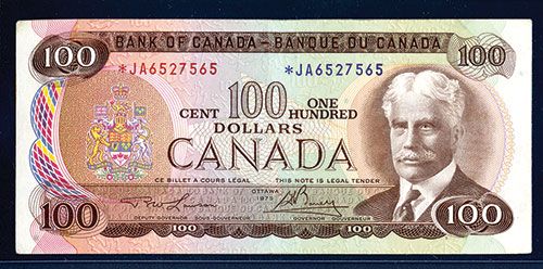 Ottawa, Canada. 1975, $100, P-91a, (BC-52aA), Issued replacement star banknote. Sir Robert Borden at right, S/N *JA6527565, Lawson | Bouey signatures, PCGS graded Very Fine 35 PPQ, Scarce note as Star Note, British American BNC.