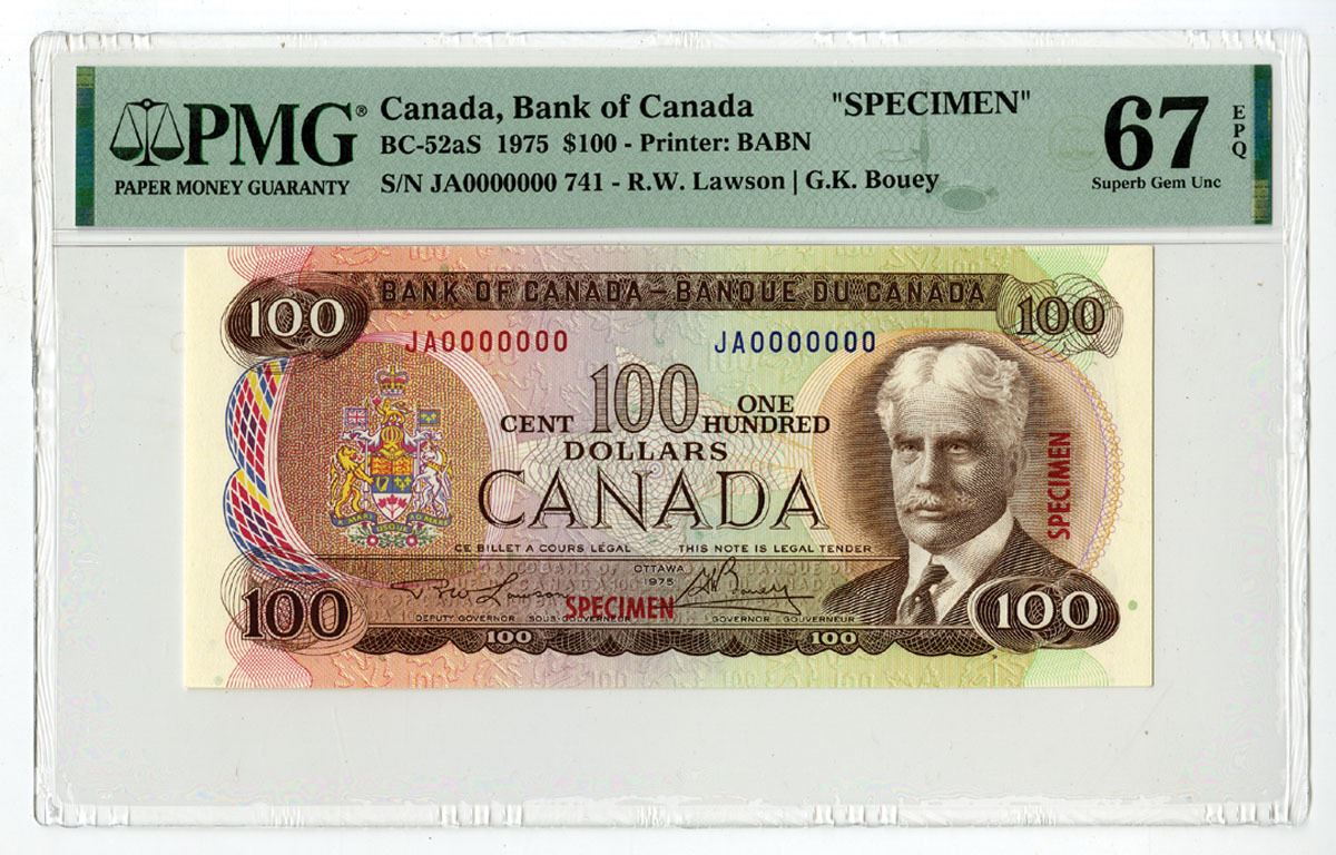 Canada. 1975. $100, BC-52aS, specimen banknote, Brown on m/c underprint with Sir Robert Borden at right, overprinted "SPECIMEN", S/N JA0000000 741, Lawson | Bouey signatures, PMG Graded Superb Gem Unc 67 EPQ, Tied with 6 other notes as highest graded out of 80 graded in the PMG census. BABN.