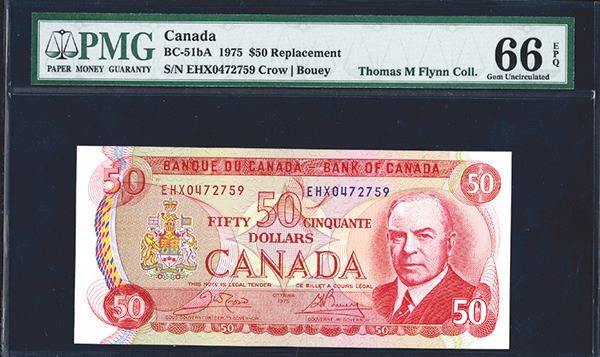 Canada, 50 Dollars, BC-51bA, replacement note, graded by PMG as Gem Uncirculated 66 EPQ. Ex-Thomas M. Flynn Collection.