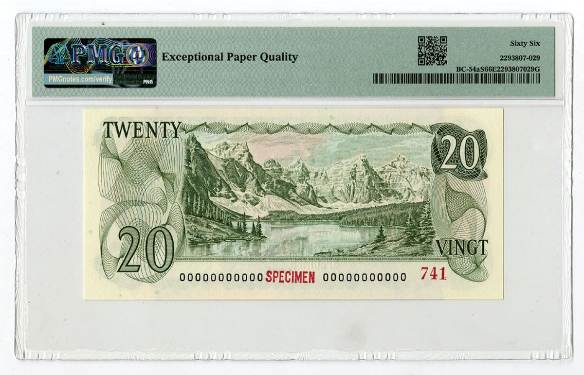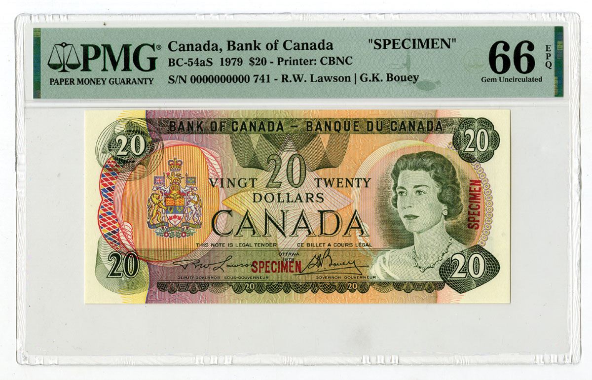 Canada, 1979. $20, P-93aS, BC-54aS, Specimen Banknote, Deep olive-green on m/c underprint with the late Queen Elizabeth II at right, Lawson | Bouey signatures, Red Specimen overprints, S/N 00000000000 741, Printer: CBNC, PMG graded Gem Uncirculated 66 EPQ.
